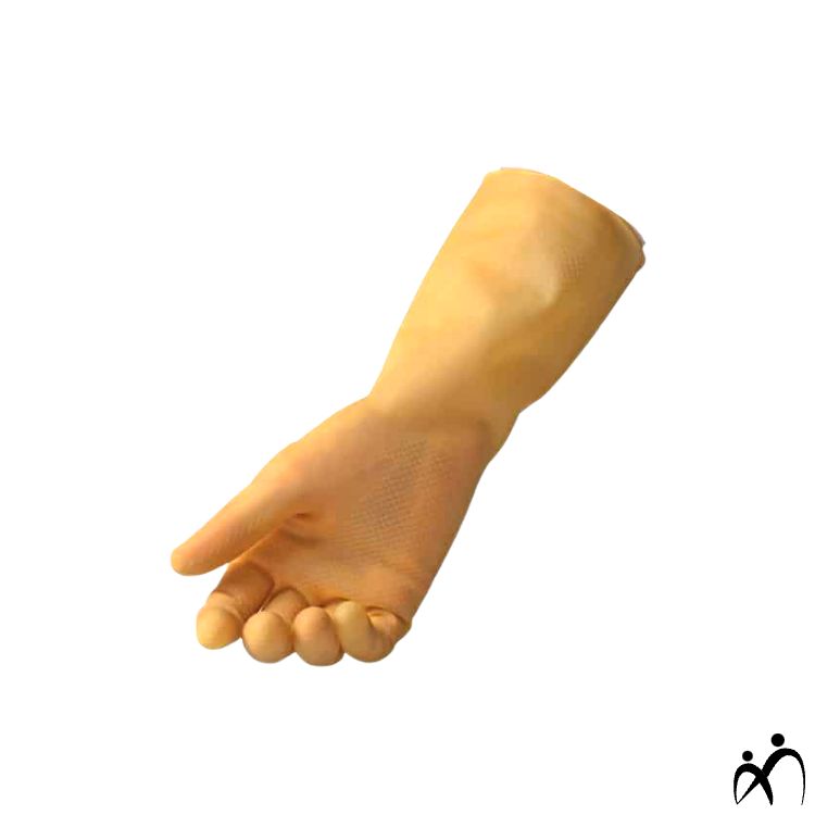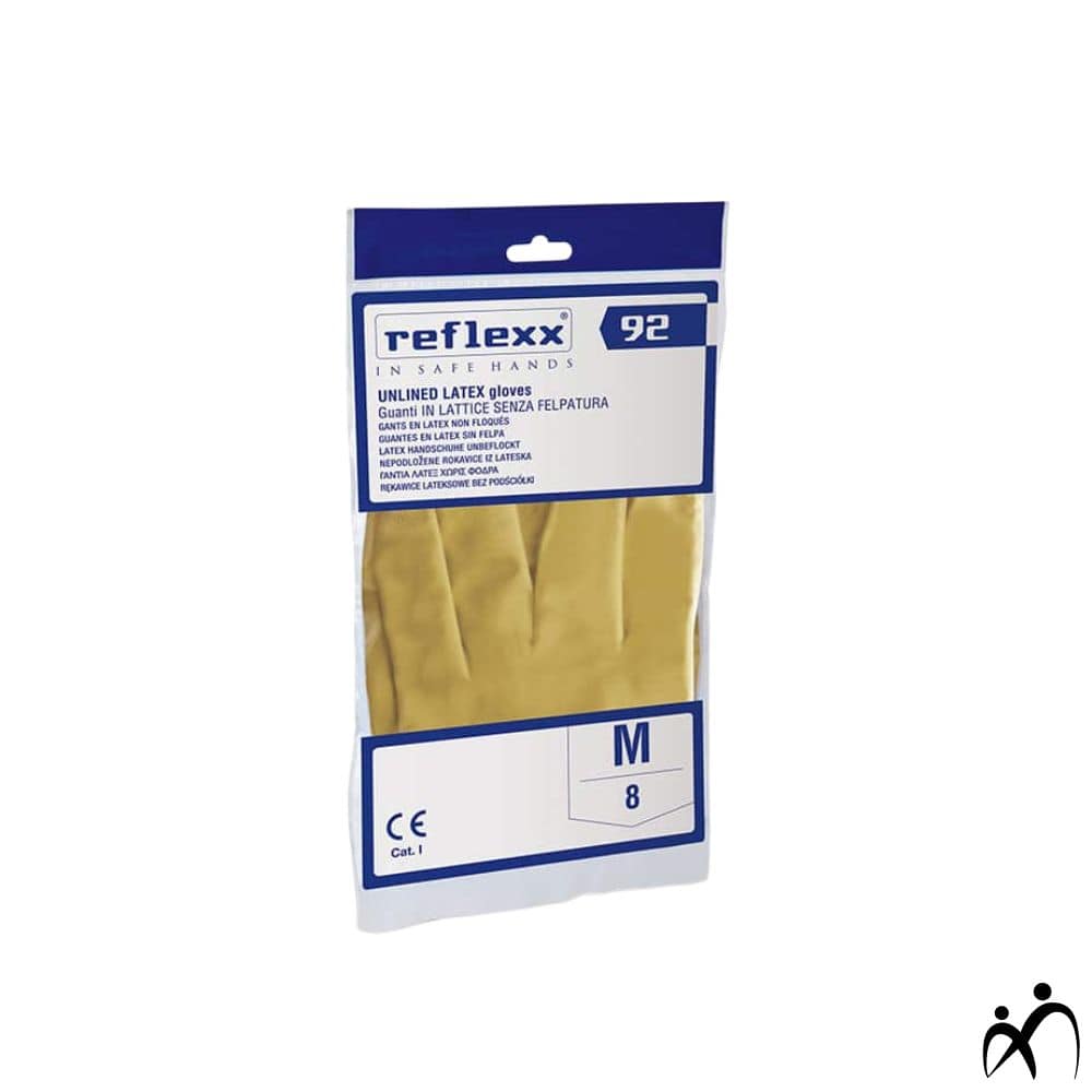 Guanti riutilizzabili in lattice senza felpatura, con bordino antigoccia e zigrinatura antiscivolo.