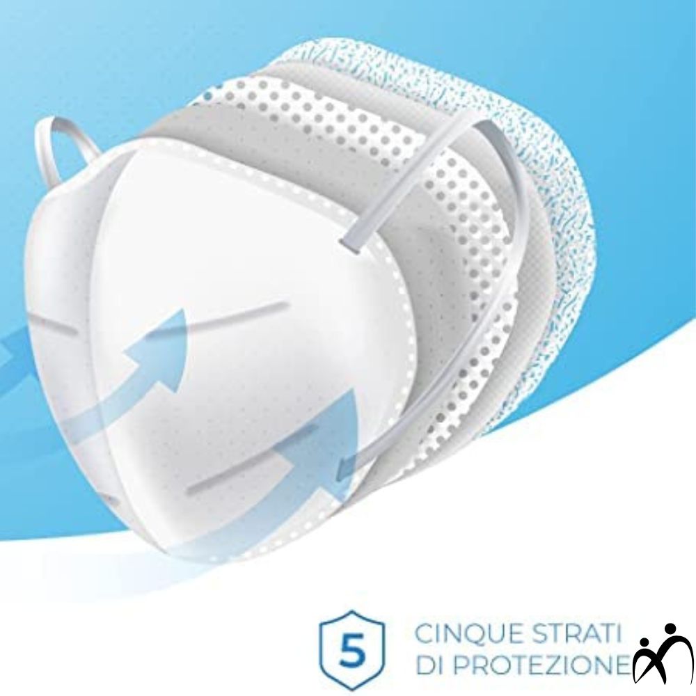 Dispositivo di protezione individuale – Mascherina FFP2 senza valvola, capace di filtrare più 98% delle microparticelle sospese nell’aria. Made in Italy.